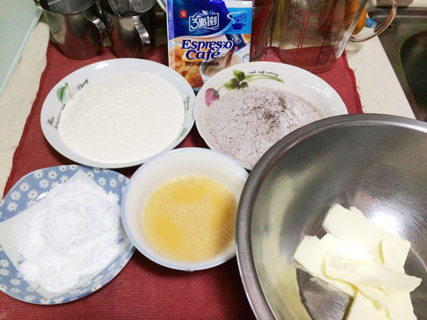 低筋麵粉100g ,全蛋40g ,無鹽奶油50g ,糖粉35g,義式濃縮咖啡1包 ,可可粉5g