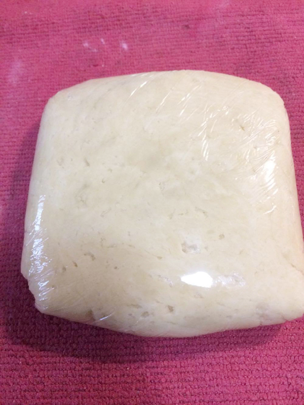 4. 之後把過篩後的麵粉倒入,用切拌手法混合麵糰,用保鮮膜包起來放冰箱冷藏定型