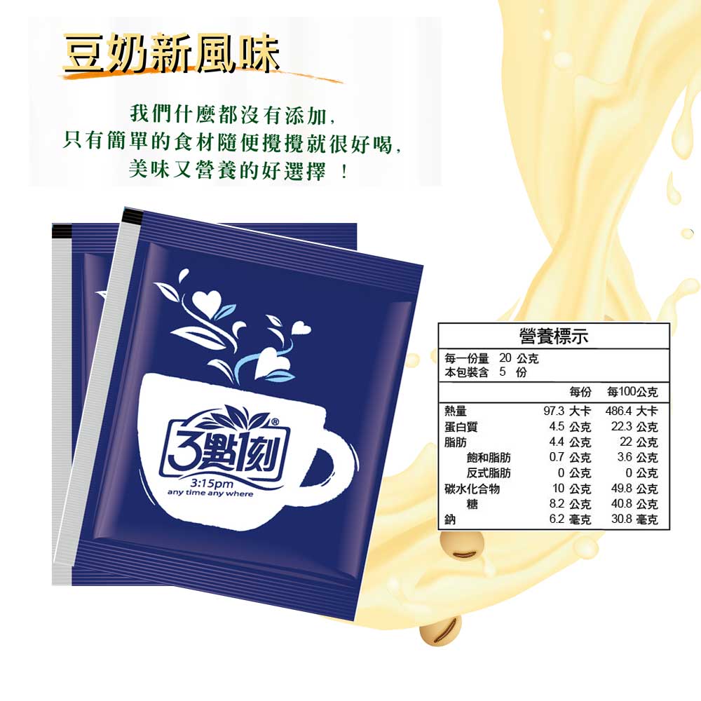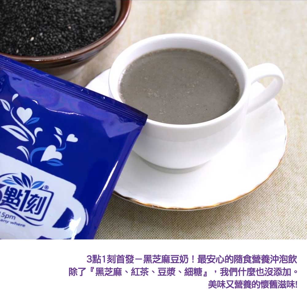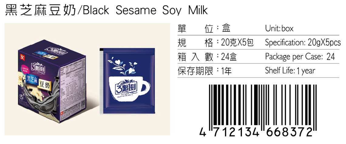 豆漿粉、細糖、黑芝麻粉、紅茶粉