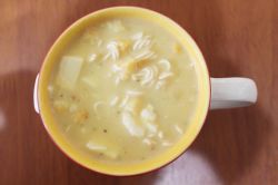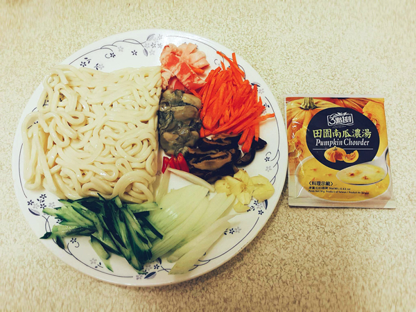 (1) The pumpkin soup is stirred evenly with 150cc of hot water, and the udon noodles are poured into the hot water and boiled.