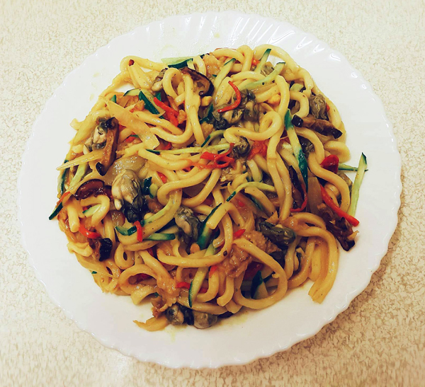 Add a little soy sauce, sugar, and pepper, then add udon noodles and stir fry,