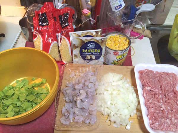 2. Raise another little oil pan, fry the onion and ground meat until fragrant and change color, then add snow peas, corn kernels, and shrimp to fry until