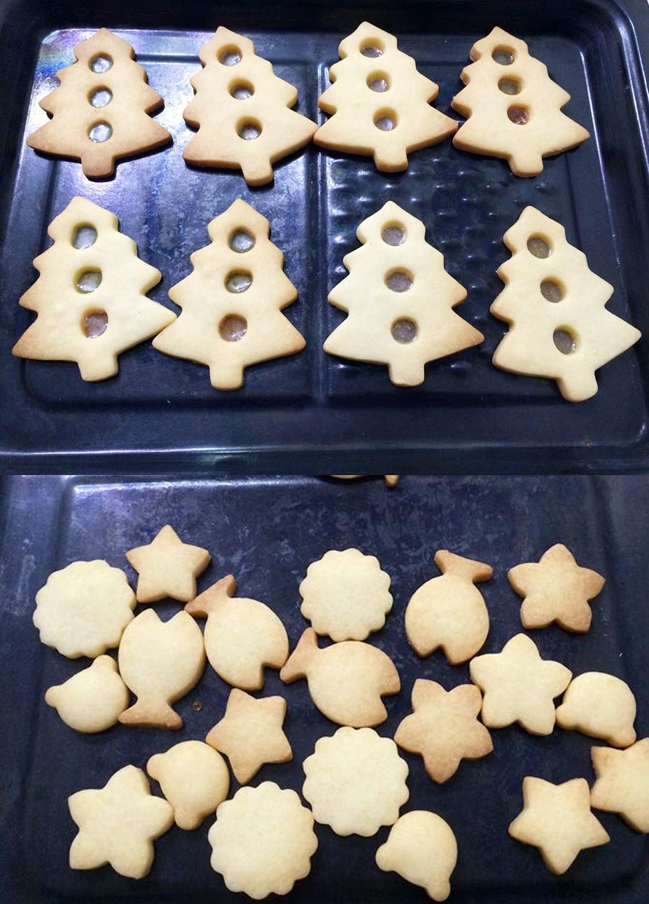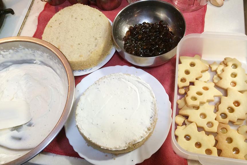 2. Put a layer of whipped cream in the middle, then put some powder rounds and then put another piece of cake