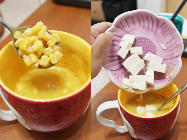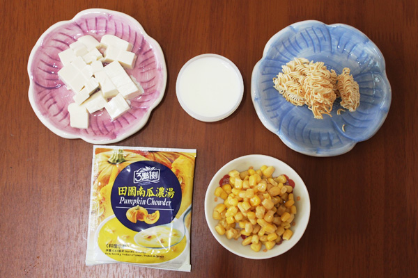2. Add materials according to personal preference, mainly the food that is easy to obtain and keep in the office. Add tofu, instant noodles, and canned corn.