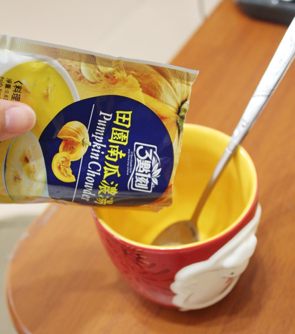 1. First soak the pumpkin soup bag at 3:15 in half a cup of hot water.