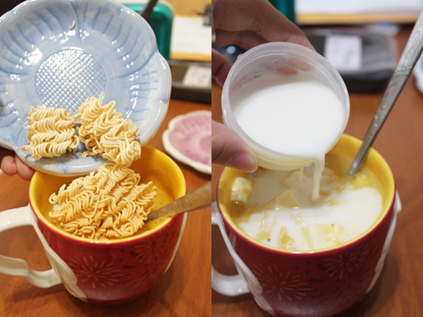 3. Wait for about five minutes. After the instant noodles have softened, pour the milk (you can replace it with milk powder, soak it together in step 1).