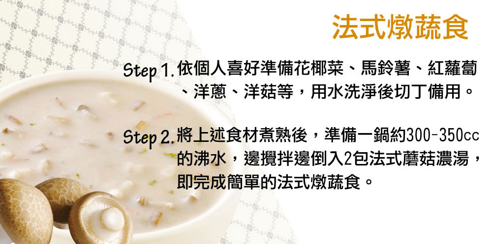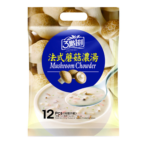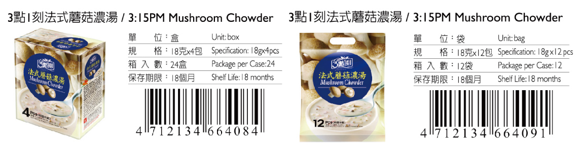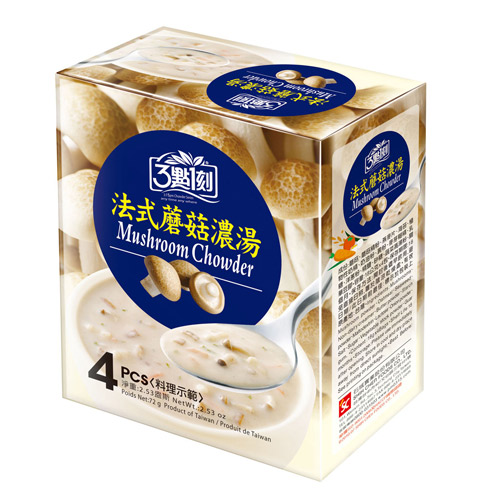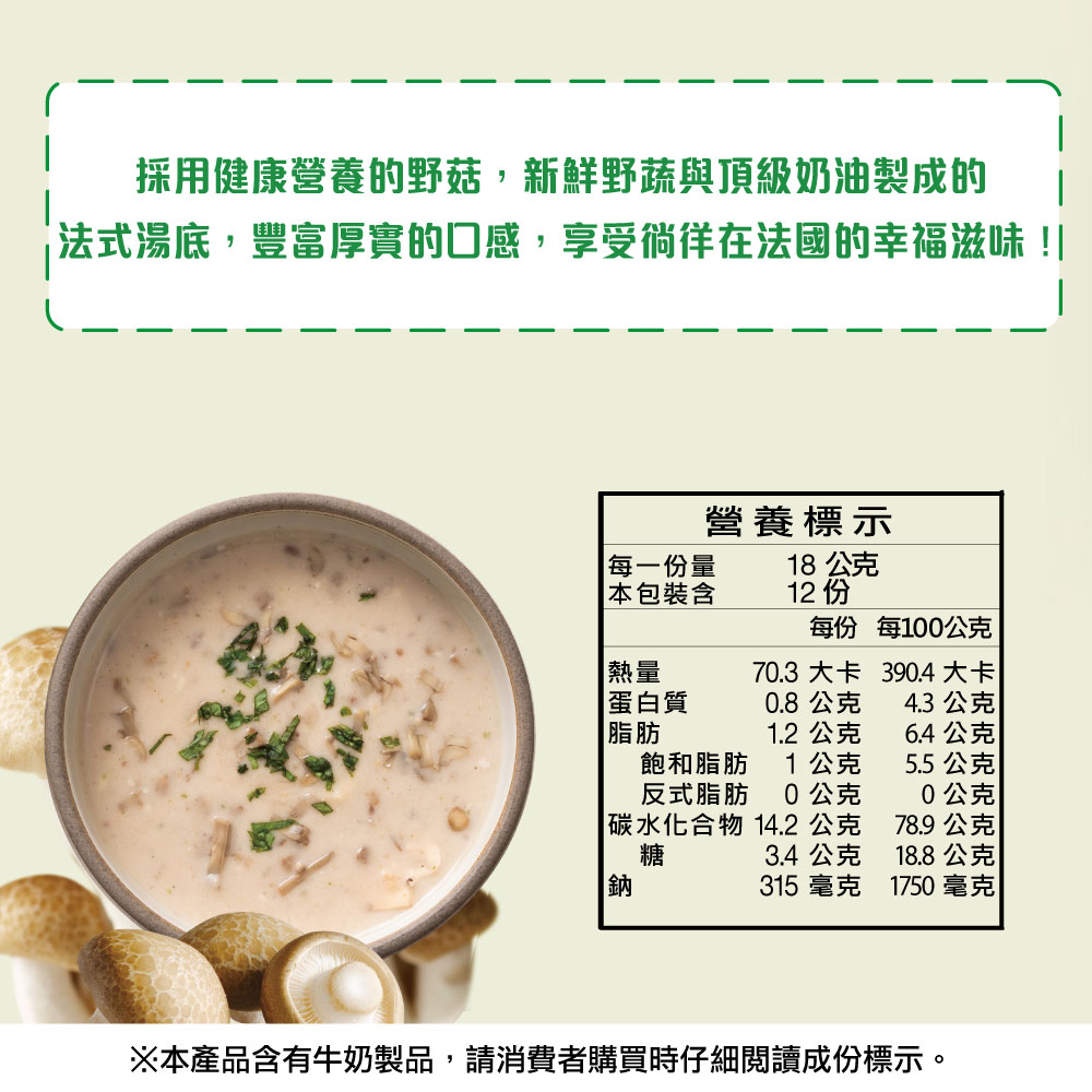 • 內容物:乙醯化磷酸二澱粉、奶精、麥芽糊精、蘑菇味濃湯粉、燕麥片、乳糖、細糖、白奶香粉、洋菇角、精鹽、洋蔥粉、蔬菜風味高糖粉、膠質、海苔片、二氧化矽。