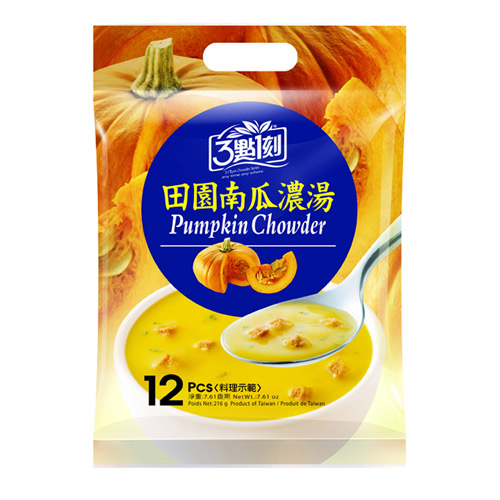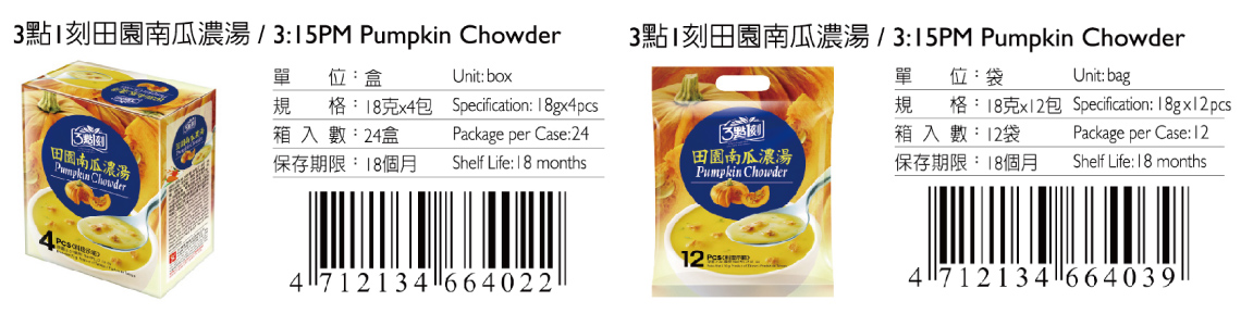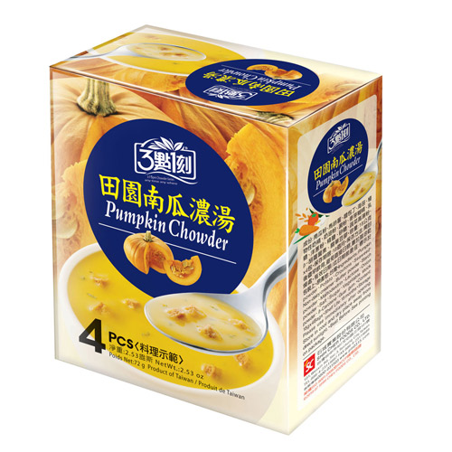 • 內容物:乙醯化磷酸二澱粉、奶精、奶油南瓜風味濃湯粉、馬鈴薯粉、南瓜粉、乳糖、南瓜粒、麵包丁、細糖、精鹽、麥芽糊精、 麵包粉、膠質、蔬菜風味高湯粉、β-胡蘿蔔素、洋蔥粉、海苔片、二氧化矽