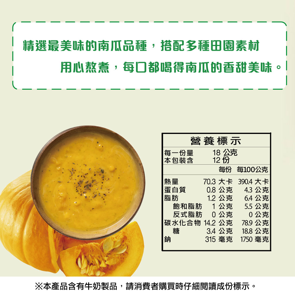 精選最美味的南瓜品種,搭配多種田園食材用心熬煮,每口都喝得到南瓜的香甜美味。