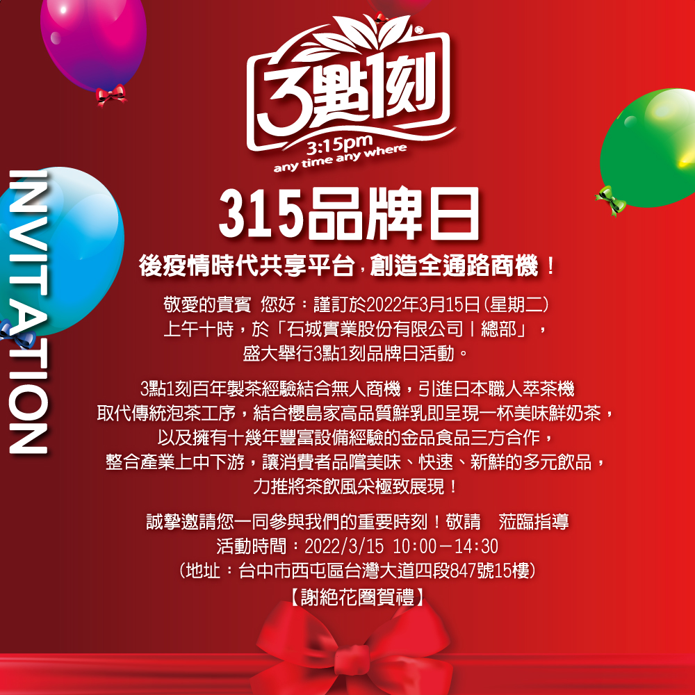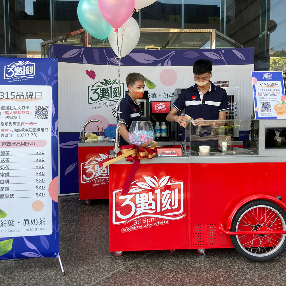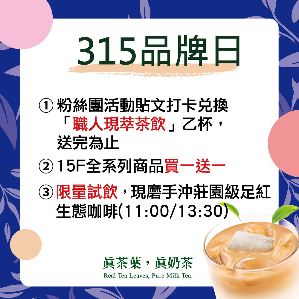 來到3點1刻生日慶會場打卡留言,即可免費品嚐職人現萃茶飲~